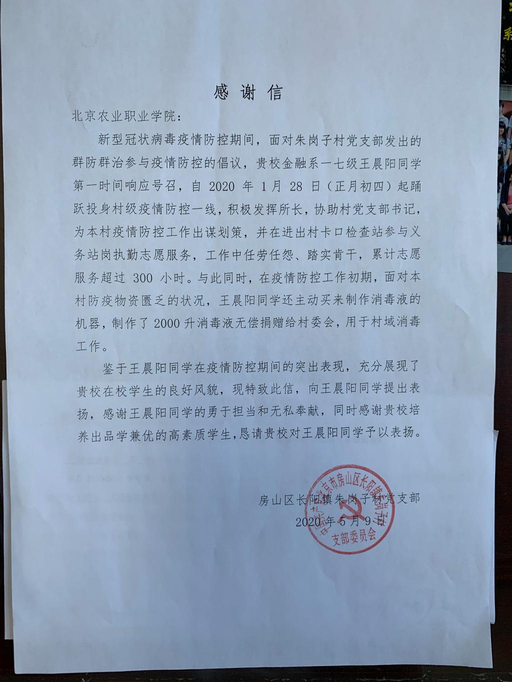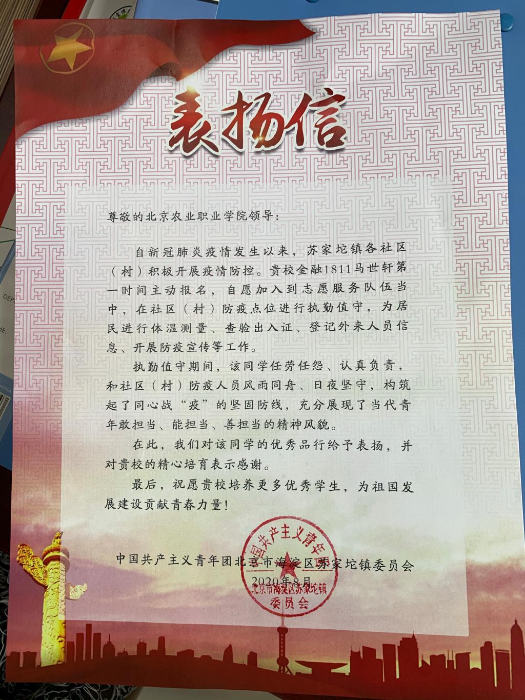 北京疫情爆发初期,各社区、村庄的执勤值守铸成了抗疫防控的第一道安全防线,急缺人手,我系金融1711班王晨阳,金融1811班马世轩两位同学,主动加入到防疫防控执勤值守志愿服务队伍中,承担测量体温,查验出入证、登记人员信息等工作,为抗疫防控队伍注入了力量。工作中,他们认真负责,风雨无阻,展现出战“疫”有我的责任担当,得到了社区、村庄居民的不断好评和村委会和镇共青团委员会的充分肯定。