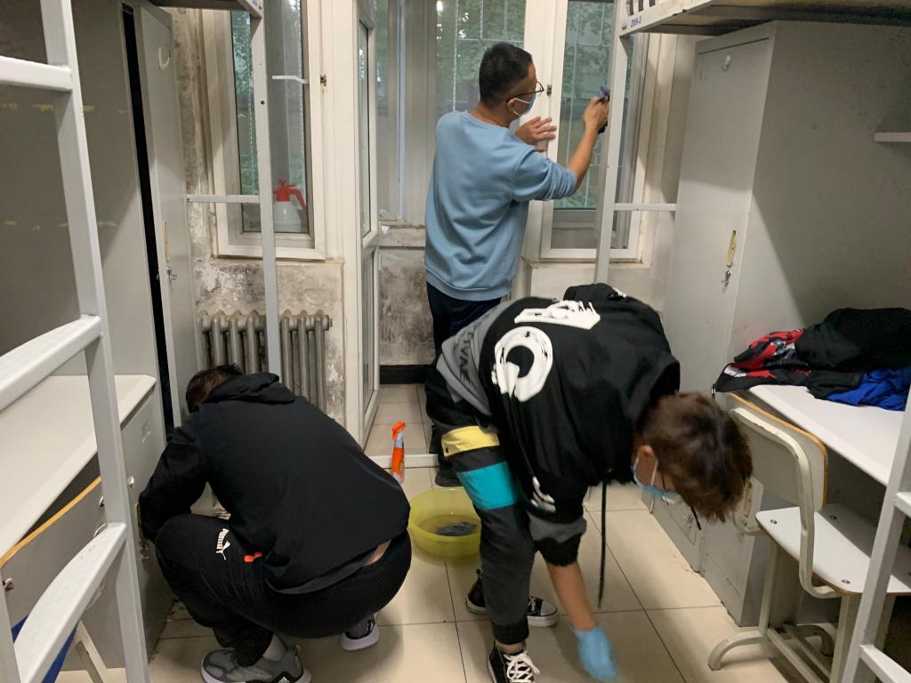 开学以来,财金系总支书记和学办主任、辅导员多次到北区(本系)学生宿舍认真了解情况,确认了该宿舍楼学生宿舍的难点在于门、家具和阳台。国庆节前,三位老师选择了一个典型宿舍进行清洗试验,确定了大扫除的标准和需要的清洗用品,并报请后勤服务中心在节日期间准备采购清洗物品。