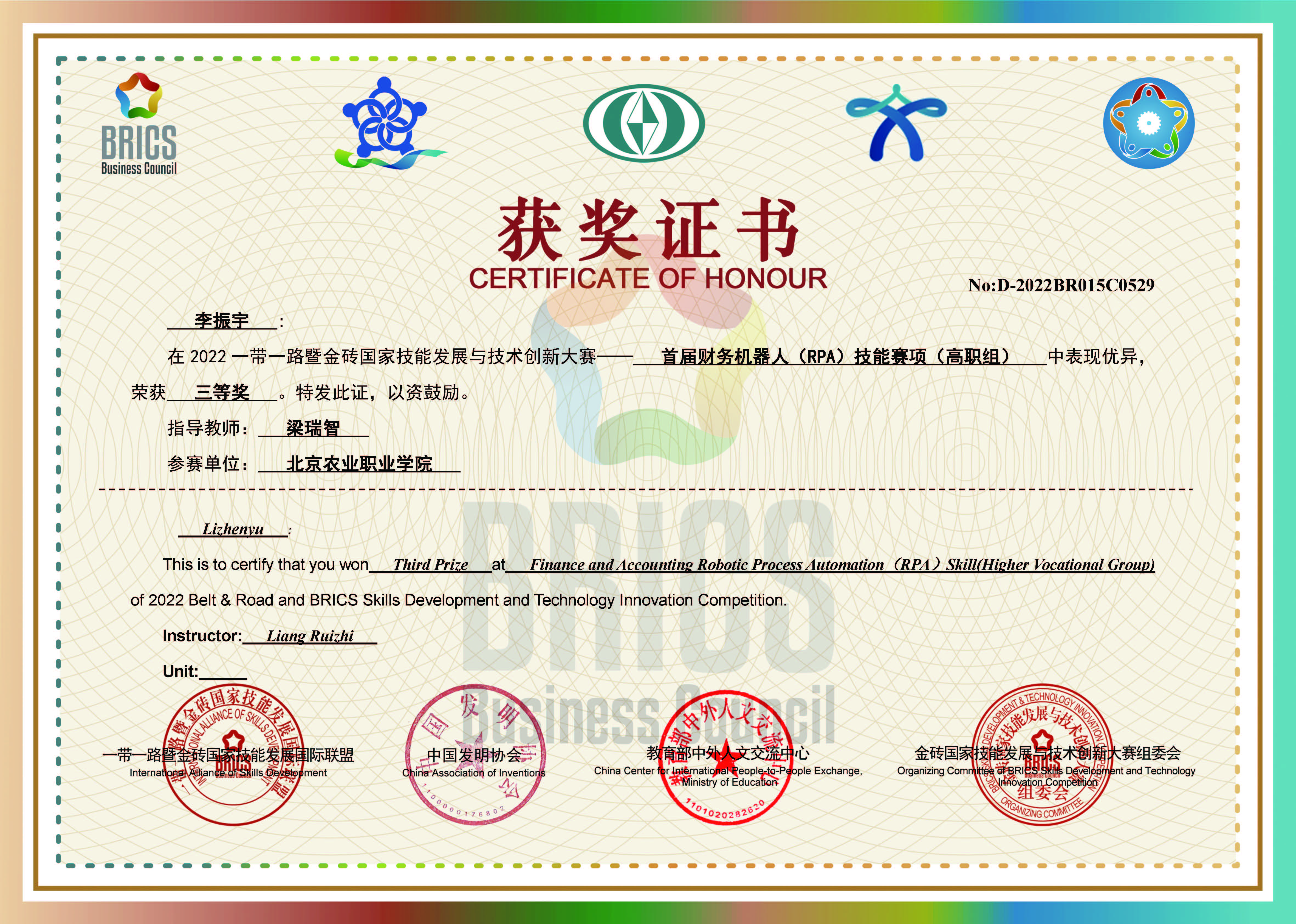 我系大数据与会计专业李振宇同学在2022年一带一路暨金砖国家技能发证与技术创新大赛中,荣获首届财务机器人(RPA)技能赛项(高职组)“三等奖”。