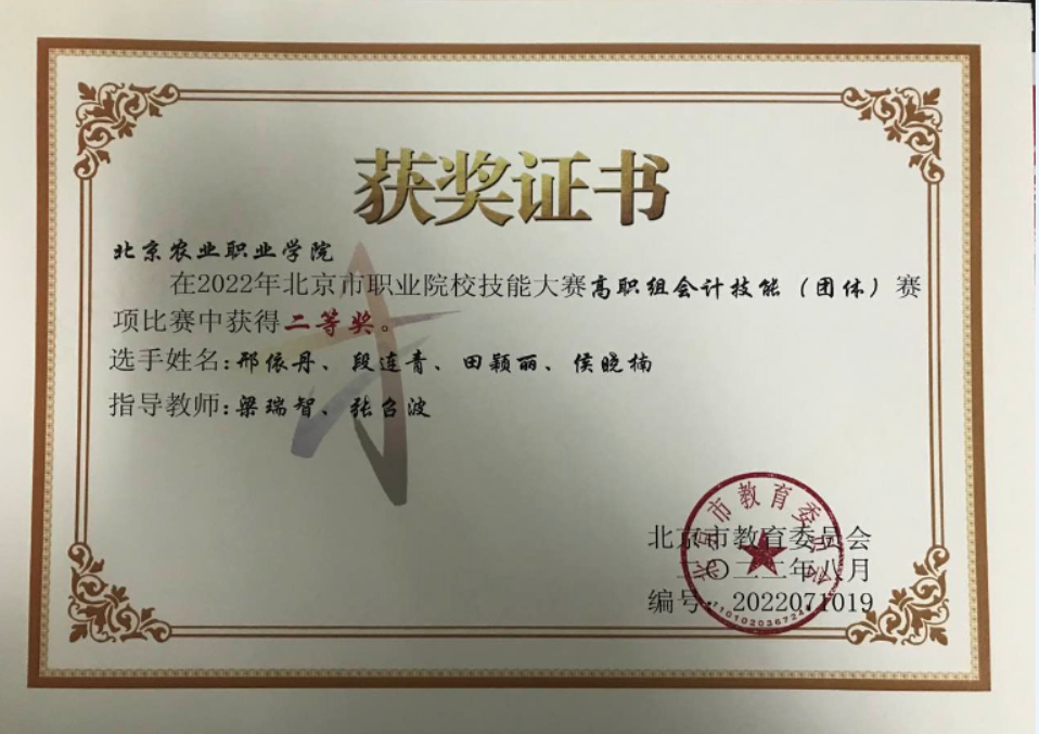 我系邢依丹、段连青、田颖丽、侯晓楠四名同学在2022年北京市职业院校技能大赛高职组会计技能(团体)赛项比赛中获得“二等奖”。