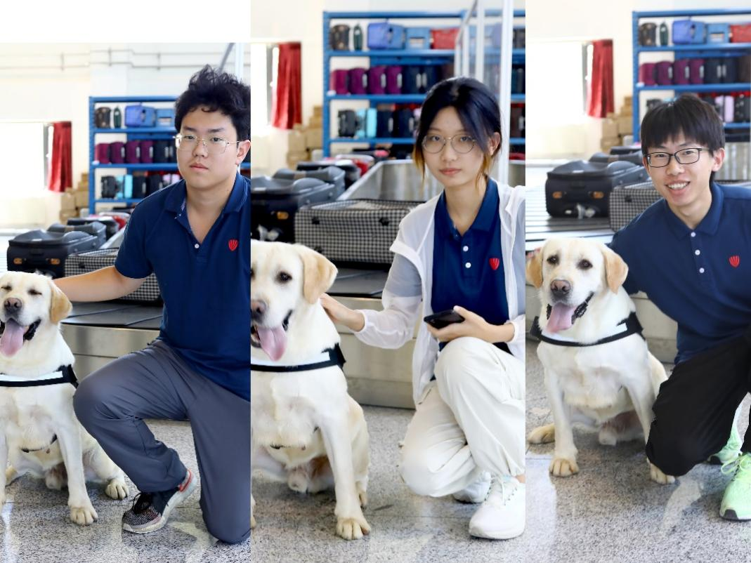 三名志愿者跟缉私警犬合影