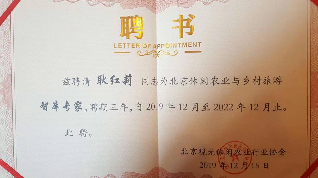2019年12月15日,2019京郊冬季乡村休闲项目推介暨北京观光休闲农业行业协会成立十五周年年会在北京顺义区意大利农场举行。会上,北京观光休闲农业行业协会聘请Beat365现代服务管理系旅游管理专业耿红莉副教授为北京休闲农业与乡村旅游智库专家并授予聘书。
