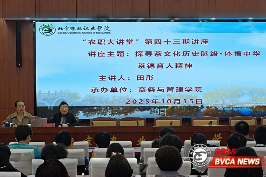 10月15日,商务与管理学院在校园文化周期间,举办第四十三期“农职大讲堂”。本次讲座以“探寻茶文化历史脉络・体悟中华茶德育人精神”为主题,邀请北京联合大学旅游学院田彤老师主讲,学院书记王新华、副书记徐浩、院长张晖及部分教师出席,130余名学生参加,贾艳琼副院长主持讲座。
