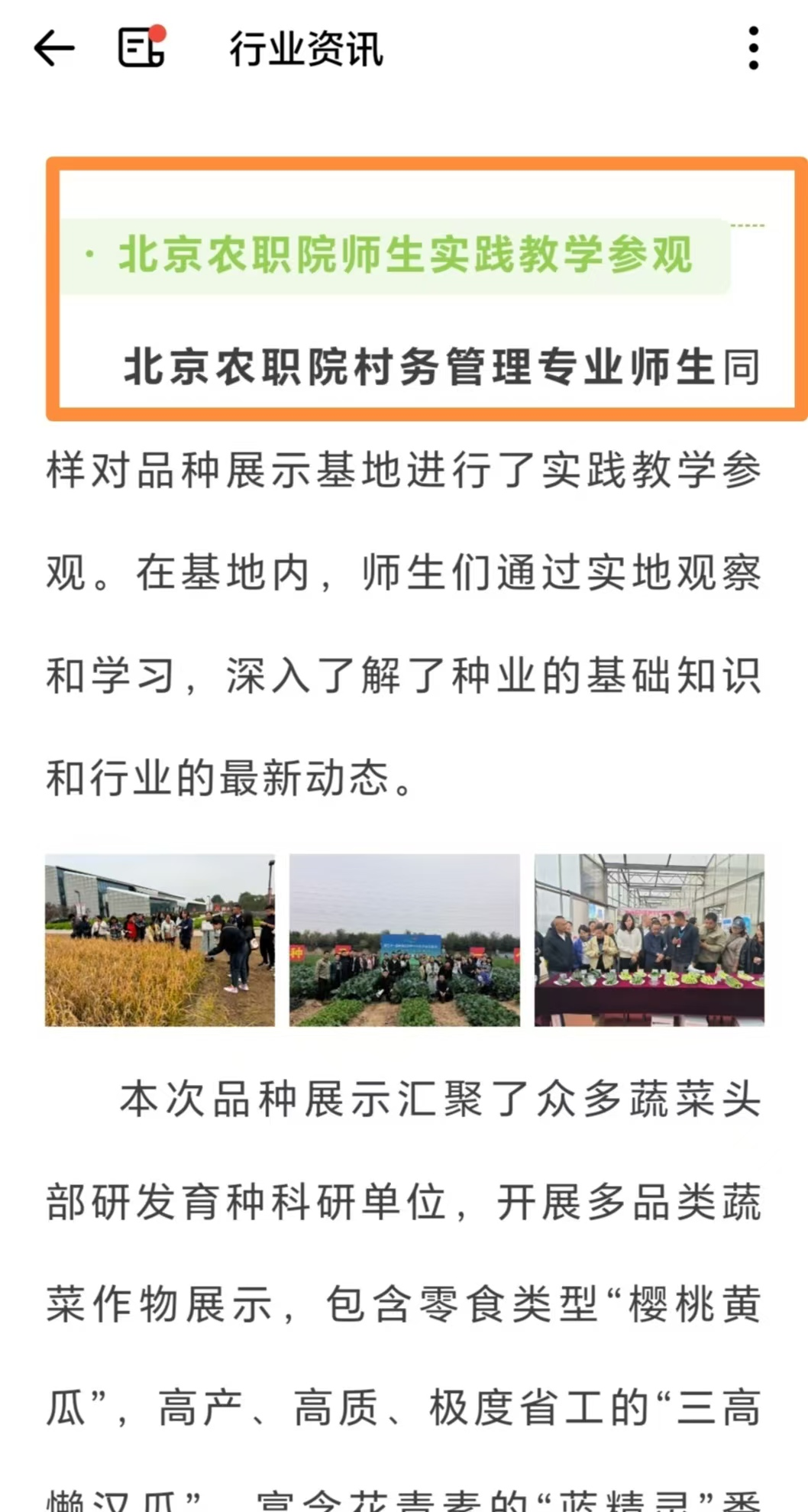 本次现场教学活动受到北京种业丰台大会品种展示基地的高度重视,由丰台区农业农村局农业科技术负责人梁海坡负责接待,并进行了全程讲解。同时村务管理专业师生现场实践教学活动被北京市丰台区农业农村局官微“丰台三农”报道。