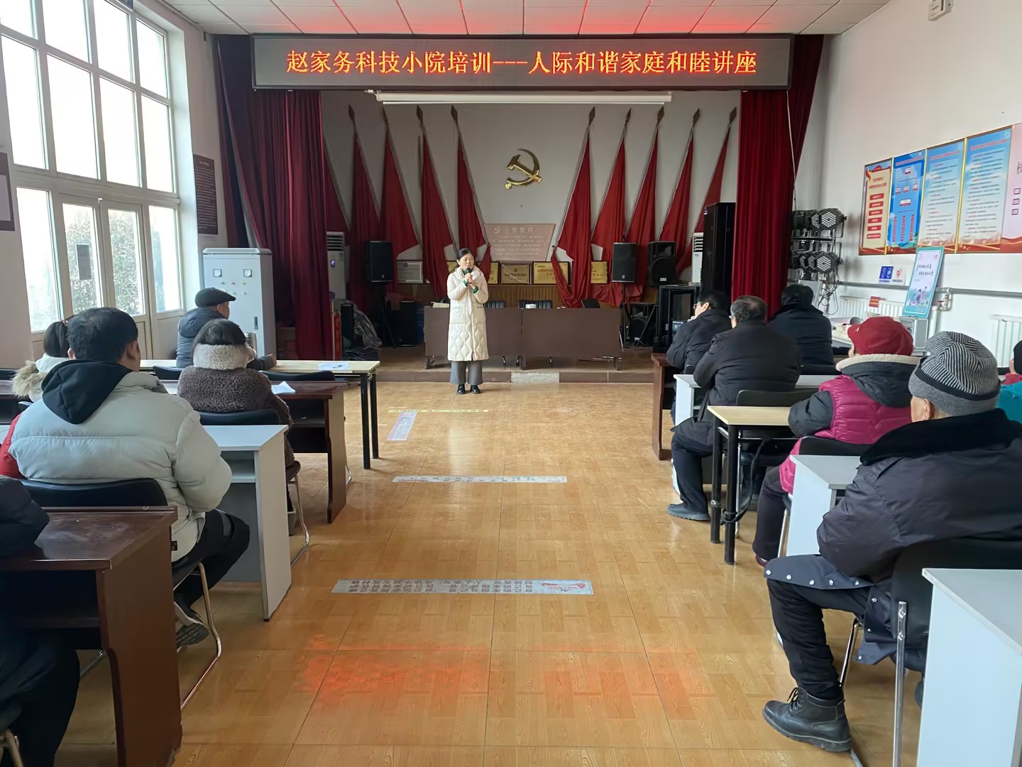 2024年1月12日,商务与管理学院赵家务村科技小院师生赴平谷区东高村镇赵家务村,开展了两场培训。培训主题为“农村人际和谐家庭和睦”及“休闲农业茶艺服务”, 40余人参加。