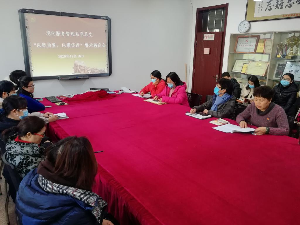 2020年12月18日,现代服务管理系党总支召开“以案为鉴,以案促改”警示教育会,系党总支书记陈丽清同志主持,全体党员和教职员工参加。