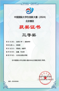 2023年北京农学院科学技术协会和北京农村专业技术协会颁发的“美丽乡村,振兴有我”短视频创作大赛三等奖;