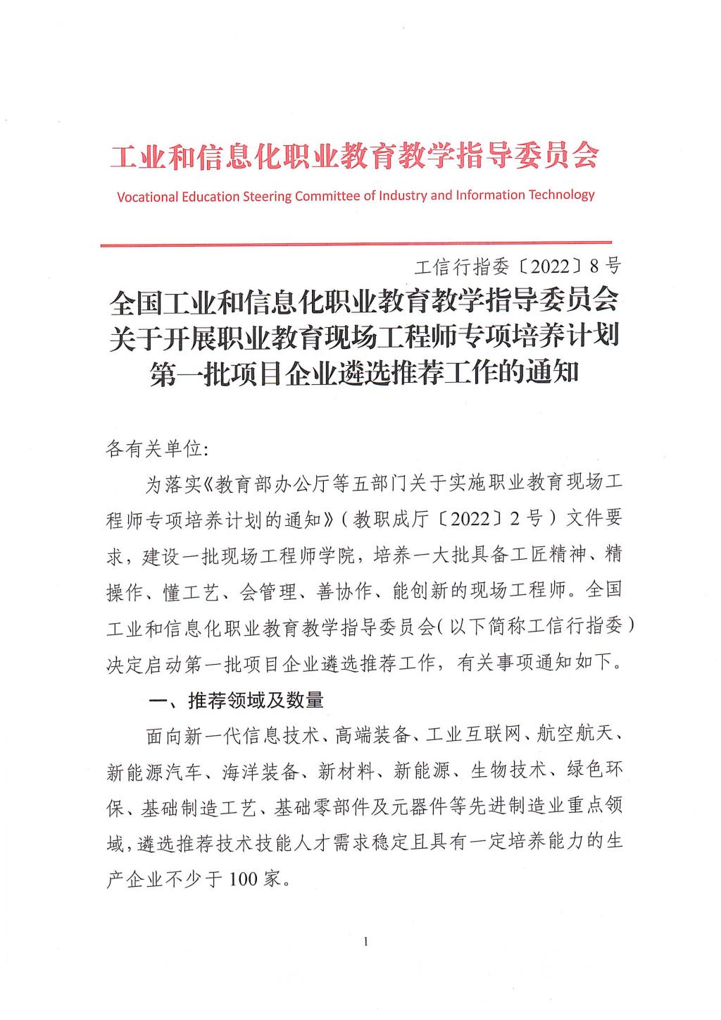 全国工业和信息化职业教育教学指导委员会关于开展职业教育现场工程师专项培养计划第一批项目企业遴选推荐工作的通知