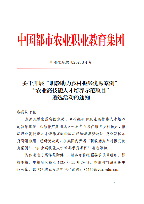 中国都市农业职业教育集团关于开展“职教助力乡村振兴优秀案例” “农业高技能人才培养示范项目” 遴选活动的通知