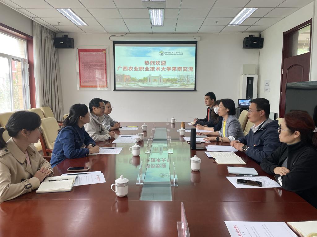 4月29日,广西农业职业技术大学高职教育研究室主任禤美琦一行来校交流。国际合作与交流处处长张红、科研处处长汤久杨、通识教育学院院长李英军、食品生物工程学院孙玉清教授及国际处相关人员参加座谈。党委常委、副校长谷天刚在会前接待了团组一行。