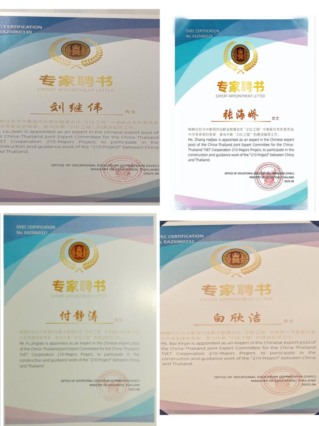 中泰职业技术教育合作“210工程”专家聘书由泰国教育部职业教育委员会颁发,明确了专家在“210工程”中的责任与义务,包括指导中泰职业技术教育的标准体系建设、数字化资源建设,推动中泰院校联合办学,建设中泰师资培训中心、数字化资源联合研发中心、国际大赛基地以及国际校企合作与就业基地等。