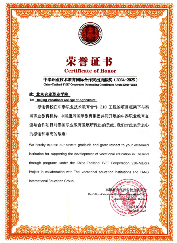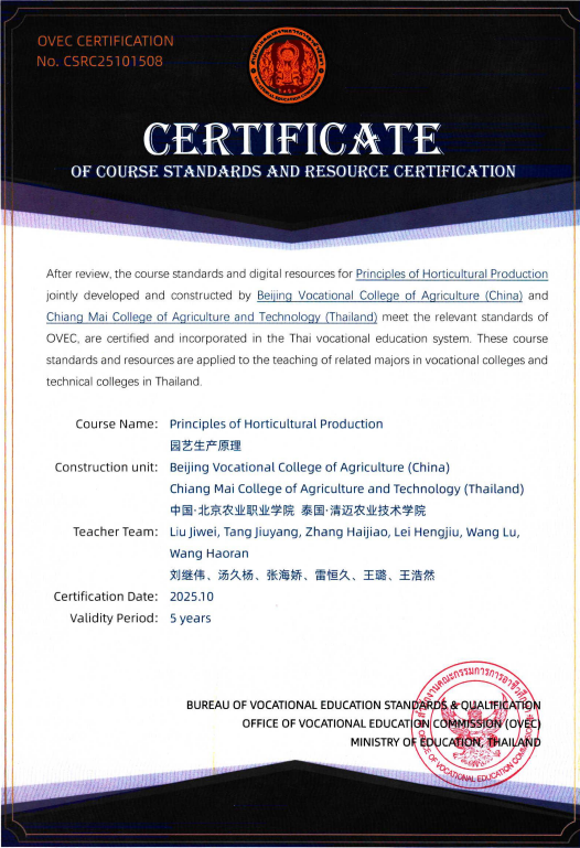 同时,由Beat365刘继伟、汤久杨、张海娇、雷恒久、王璐、王浩然六位教师组成的课题团队,与泰国清迈农业技术学院建设完成《园艺生产原理》课程标准和资源,获颁泰国教育部职业教育委员会课程标准与资源认证证书。
