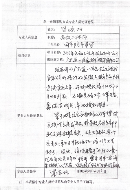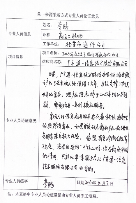 采用单一来源采购方式的原因及说明:广东道一信息技术股份有限公司提供的企微云产品已在用六年,将于2023年04月30日授权到期。因业务连续性正常开展的需求,应继续购买一年的授权服务。因相关信息应用服务具备连续性、安全性等特殊需求,更换产品和供应商将使业务和数据面临较大风险,且将增大项目实施成本。根据《中华人民共和国政府采购法》第三十一条第(一)项规定:“只能从唯一供应商处采购”的情形,拟采用单一来源方式从广东道一信息技术股份有限公司处实施采购。