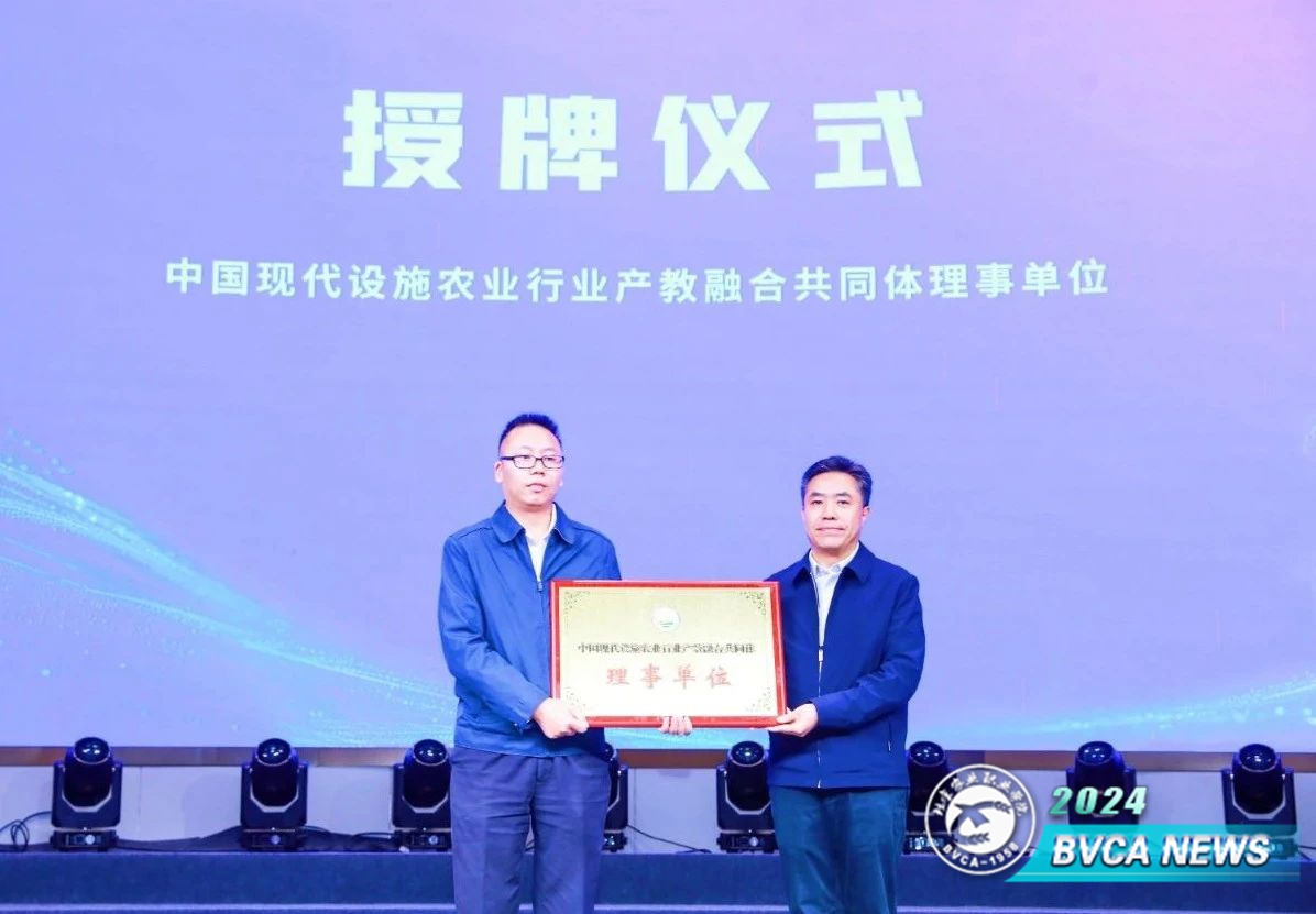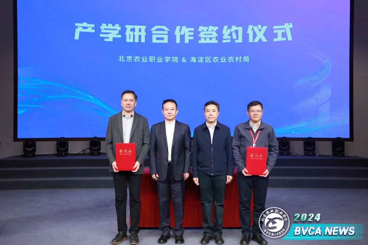 杨博为海淀区农业技术综合服务中心颁发中国现代设施农业行业产教融合共同体理事单位牌匾。智慧农业工程学院党总支副书记、院长杨学坤与海淀区委农村工作委员会书记、北京市海淀区农业农村局局长张春明共同签署产学研合作协议书。此次合作将充分发挥政府、学校及共同体的协同作用,在就业推荐、顶岗实习、实训基地建设、员工培训等多个方面开展合作,共同打造产教融合的新生态,助力“未来农业”发展。