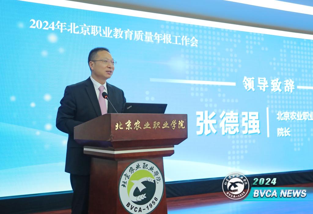 张德强代表学校致辞,对参会代表的莅临表示热烈欢迎,介绍了学校的基本情况、建设成果和发展目标,对荣获北京市优秀年报的有关单位表示祝贺。他强调质量年报制度对促进职业学校夯实内涵、持续改进、全面提高人才培养质量具有积极作用,能和全市职教战线同仁一起,共商北京市职业教育质量年报事宜,助力北京市职业教育高质量发展,感到非常荣幸。