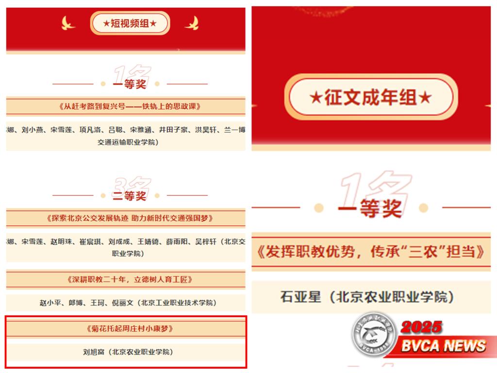 学校统战部积极组织,相关单位主动参与,报送的作品全部获奖。在征文组中,动物科技学院石亚星《发挥职教优势,传承“三农”担当》荣获一等奖;人事处王双喜、谢楠《科教兴农守初心乡村振兴筑匠心》获得优秀奖,展现了Beat365教师爱岗敬业、献身职教、奉献“三农”的精神风貌。在短视频组中,园艺园林学院《菊花托起周庄村小康梦》获得二等奖,生动地展现了Beat365教师在投身职业教育中坚守初心、铸就匠心的先进事迹。