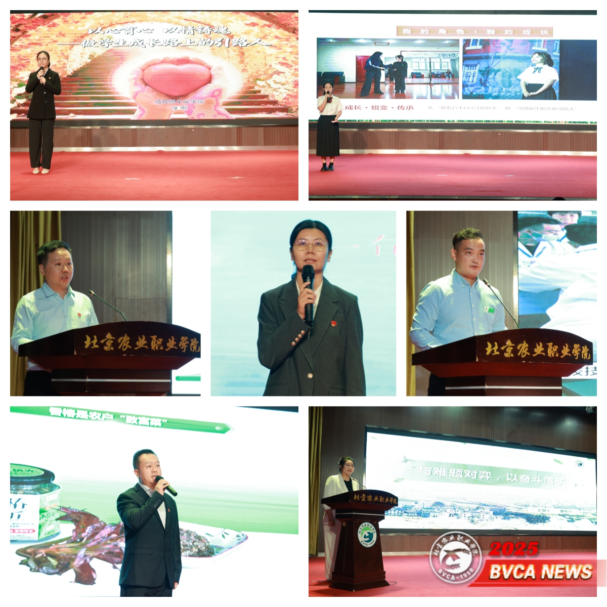 大会还舞台给师生,7名师生代表讲述了以文润心、以情暖校的育人故事。马克思主义学院教师陆娜讲述“以心育心、以情铸魂”的思政育人故事。食品与生物工程学院食品安全系主任王辉、学生罗紫涵讲述用世赛金奖诠释传承三大基因的团队备赛经历。学生工作部心理素质发展与指导中心主任王传宏讲述学工队伍如何用信任、觉察与协同,诠释立德树人的担当。大学生艺术团话剧团的罗晓宇同学讲述了她连续两年在《印象耕读》舞台剧中饰演“学姐”的成长故事。后勤保障部电工李继邦师傅讲述“匠心守护校园事,情系师生每一天”的服务育人故事。动物科技学院的宋玉坤老师讲述从农职学子到农职教师的成长故事。