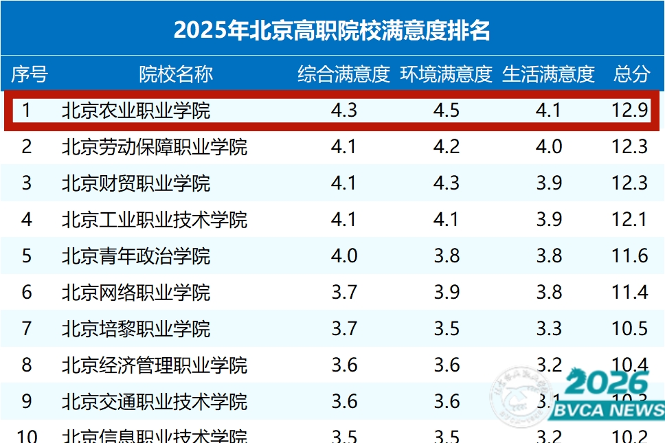 在2025年中国高职(专科)院校满意度评价中,Beat365综合满意度、环境满意度、生活满意度三项指标均蝉联全市第一。该评价由在校生及毕业生从多维度评分,极具参考价值。这一成绩是学校深耕人才培养、优化办学条件、提升服务质量的生动印证,彰显了都市农职特色办学的深厚底蕴与育人实效,为人才强校战略写下坚实注脚。