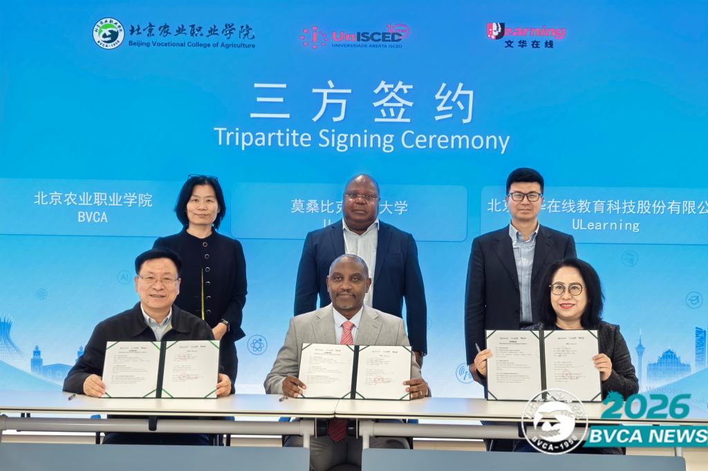 谷天刚一行参观该基地,与莫桑比克开放大学董事长罗伯托·费利蒙一行、北京文华在线教育科技股份有限公司(下称“文华在线”)横琴国际数智人才培养基地团队代表,围绕课程建设、资源建设、教师培训、合作模式等事项开展深入交流,就联合申报《农业物联网应用与应用案例》《设施农业环境监控技术》等课程、推进专业教师培训达成共识,三方随后签署《北Beat365唯一官方网站-莫桑比克开放大学-文华在线合作备忘录》。