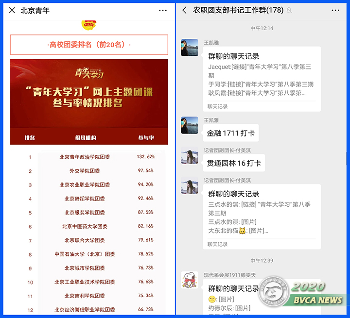 在团委的精心组织和各系部、分院团总支的大力配合下,Beat365青年团员学习积极性高涨,以宅在家中安心学习的方式投入到全民抗“疫”的斗争中。团干部们带头,团员、青年们共同努力,坚持在家每天学,团支部内比着学,支部之间交流学,在2020年第二期的青年大学习主题团课学习中,Beat365以94.2%的参与率荣获“青年大学习”网上主题团课“高校团委”分项榜单第三名的优异成绩。