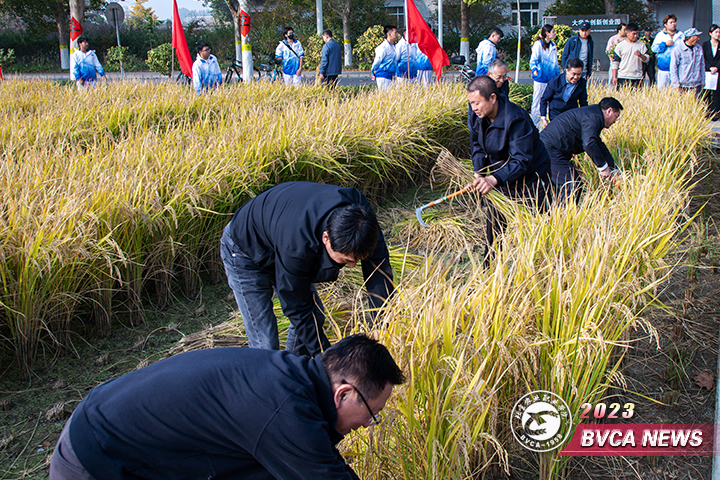 院领导为本次活动开镰。热热闹闹的稻田里,农事专家耐心指导,师生们挥镰收割、打捆垒垛,现场一副热火朝天的劳动场景,大家欢天喜地,热闹非凡。在师生共同努力下,金灿灿的稻田很快变成了成堆的谷垛,丰收活动在一片欢声笑语中圆满落幕。