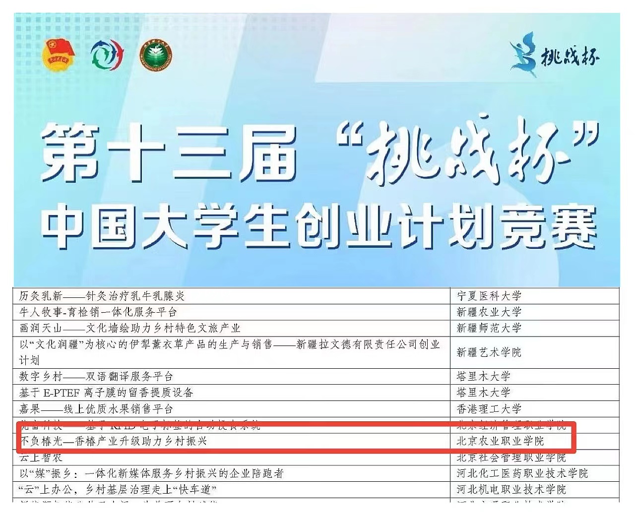 她带领团队在“挑战杯”和“互联网+”等创新创业比赛中崭露头角,荣获第十三届“挑战杯”中国大学生创业计划竞赛乡村振兴组主赛道乡村振兴和农业农村现代化国家级铜奖;“青创北京”2022年“挑战杯”首都大学生创业计划竞赛主赛道乡村振兴和农业农村现代化组金奖;第八届“互联网+”大学生创新创业大赛(北京赛区)二等奖;“京彩大创”首届北京大学生创新创业大赛乡村振兴赛道百强创业团队。