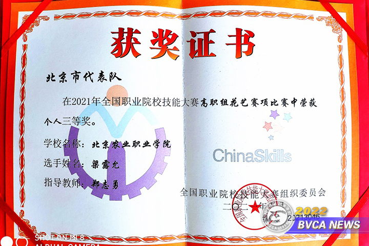 6月16至20日,2021年全国职业院校技能大赛(高职组)“花艺”赛项在山东城建职业学院举行,由园艺系副主任吴晓云领队,郑志勇副教授担任指导老师,园艺1911梁露允同学组成的北Beat365唯一官方网站代表队代表北京市参赛,荣获大赛三等奖。