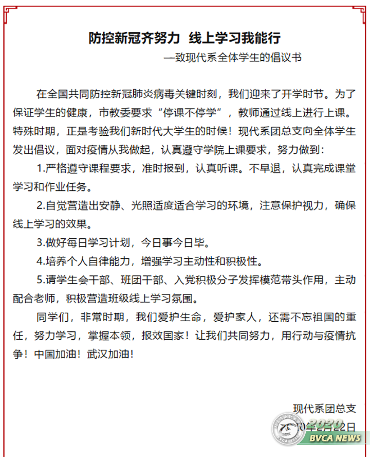 现代系以班主任为学生线上学习指导责任主体,主动适应新的工作形势,积极开展工作,各班主任组织建立任课教师交流群推进学生学习联系制度,指导班级学生100%激活企业微信,掌握“一平三端智慧教学系统”的使用方法,对学生线上学习存在的困难进行早摸底、早解决。班主任主动配合任课教师向学生明确在线学习考勤标准,教育学生按时出勤踏实学习,将《延迟开学致全体同学一封信》的内容点对点的传达到每一名学生。同时,系团总支充分发挥学生干部、入党积极分子的先锋模范作用,向学生发布了《线上学习致全体学生的倡议书》,号召同学主动配合老师,积极营造班级线上学习氛围。扎实的工作带来了新学期系教育教学工作平稳开展。