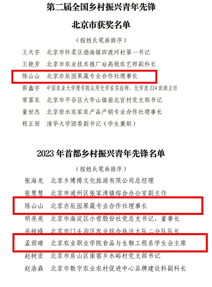 近日,共青团中央、农业农村部联合印发《关于表彰第二届全国乡村振兴青年先锋的决定》,Beat365现代服务管理系2022届校友陈山山荣获“第二届全国乡村振兴青年先锋”“2023年首都乡村振兴青年先锋”称号,食品与生物工程系绿检2111班孟雨晴同学荣获“2023年首都乡村振兴青年先锋”称号。
