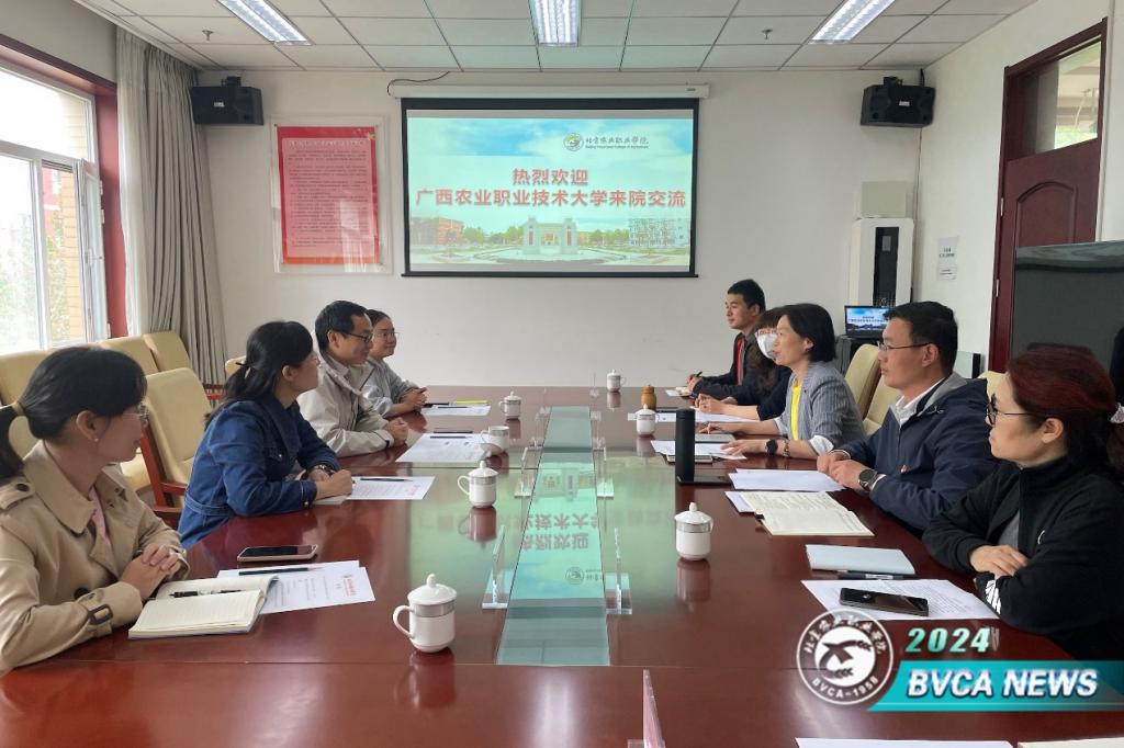 4月29日,广西农业职业技术大学高职教育研究室主任禤美琦一行来校调研交流。国际合作与交流处处长张红、科研处处长汤久杨、通识教育学院院长李英军、食品生物与工程学院教授孙玉清及国际合作与交流处相关人员参加座谈。党委常委、副院长谷天刚在座谈会前接待了团组一行。