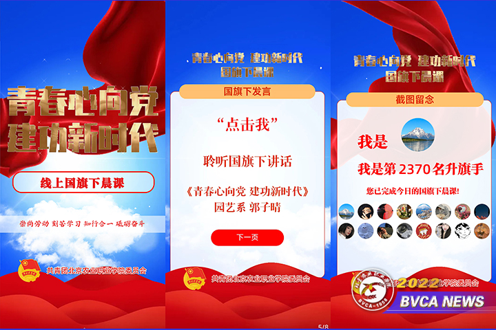 早上7时,学生通过网络小程序进入“线上国旗下晨课”页面,面向屏幕中的国旗肃立,行注目礼。伴随着《义勇军进行曲》,学生们高唱国歌,滑动屏幕亲手升起五星红旗!学生代表园艺系郭子晴发表题为《青春心向党,建功新时代》的国旗下演讲,号召新时代的农职学子书写好青年人的“人”字,做一个有坚定信仰的人、有责任担当的人、有过硬本领的人,努力使自己成为一名“召之即来、来之能战、战之必胜”的能用之才,用实际行动向党的二十大献礼!