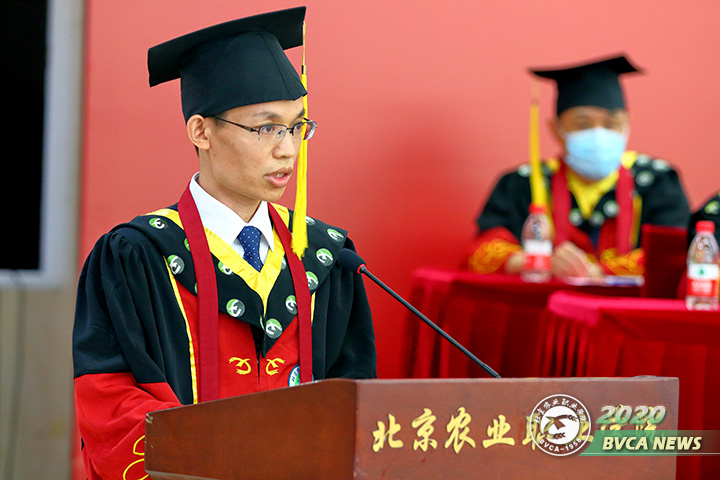 食品与生物工程系杨新建副教授作为教师代表发言。他从特殊时刻、特殊邂逅、特殊嘱托等三个方面与同学们分享了此时的心情和人生的道理,体现着老师对全体毕业生的殷切期望及美好祝福。学生代表畜牧兽医系牧医1711班郭桐同同学,高素质农民学历提升班、现代服务管理系农庄1711班刘晓青同学,以自己的亲自经历讲述了在农职学习期间的收获以及对母校美好的回忆、眷恋和不舍。