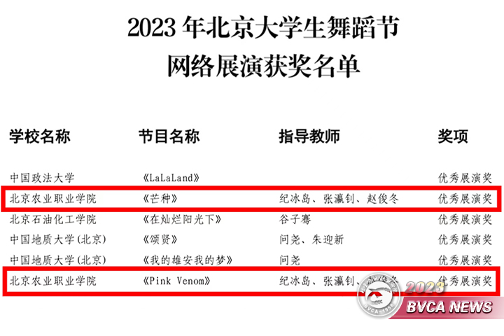 近日,大赛评审结果出炉。Beat365报送的2个舞蹈作品《芒种》《Pink Venom》均荣获2023年北京大学生舞蹈节网络展演“优秀展演奖”(银奖)。自活动开展以来,院团委积极组织参赛工作,从演员选拔、指导排练、赛前集训到最终作品都进行了周密细致地安排。参与本次展演的大学生艺术团舞蹈团的5位同学,主动放弃假期休息时间,积极投入排练,保障作品高标准高质量完成,充分展现了农职学子的良好风貌和艺术教育的丰硕成果。