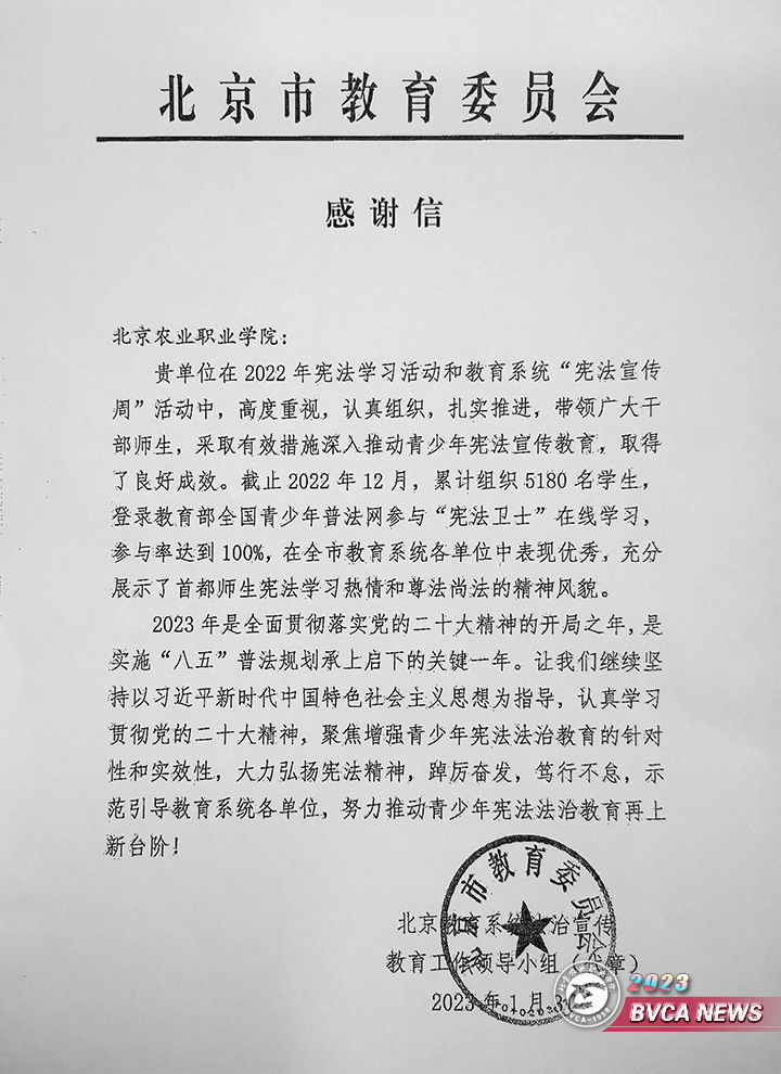 3月30日,学院收到来自北京市教育委员会的感谢信,信中指出,学院在教育部全国青少年普法网参与“宪法卫士”在线学习参与率达100%。信中对Beat365给予的大力支持表示感谢。