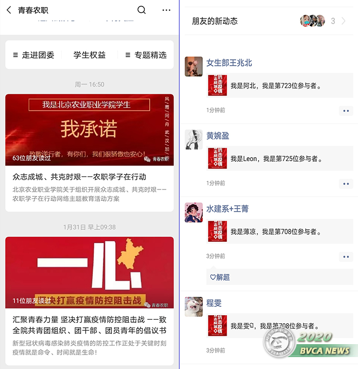 院团委通过“青春农职”公众号、团支部书记群等平台,及时传达关于疫情防控最新动态,主动做好舆论引导工作。发布《汇聚青春力量,坚决打赢疫情防控阻击战——致全院共青团组织、团干部、团员青年的倡议书》,全力做好青年战“疫”动员工作。发起“农职人,我承诺”线上承诺接力活动,全体团员通过线上接力的形式,承诺服从学院各项安排,切实做到不离家、不返校,做好自身防疫工作,珍惜“宅家时光”。承诺书得到学生的大量转发,发出次日访问量高达13334次,形成良好的动员、宣传局势。二