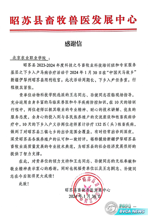 2024年1月22日,应新疆维吾尔自治区昭苏县畜牧兽医发展中心邀请,动物科技学院王志副教授、孙健副教授前往昭苏县,为乡镇兽医技术人员和养殖户开展了为期10天的技术培训和社会服务工作。