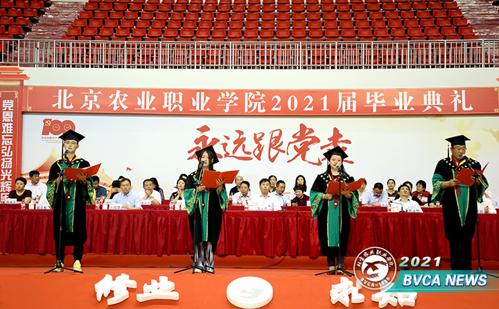 普通高职毕业生代表、贯通制毕业生代表、高素质农民班毕业生代表和村务管理班毕业代表等4名同学以诗朗诵的形式抒发了对学院、老师和同学们的感谢、感恩和眷恋,并发出了“强国有我!强农有我!请党放心!请学院放心!”的号召。