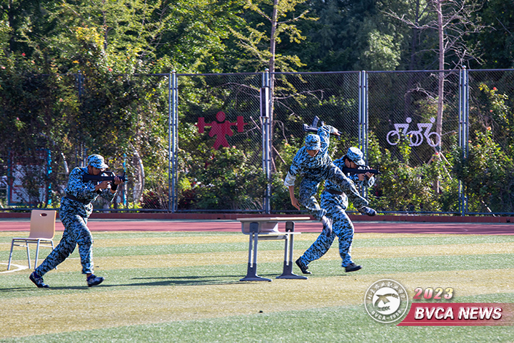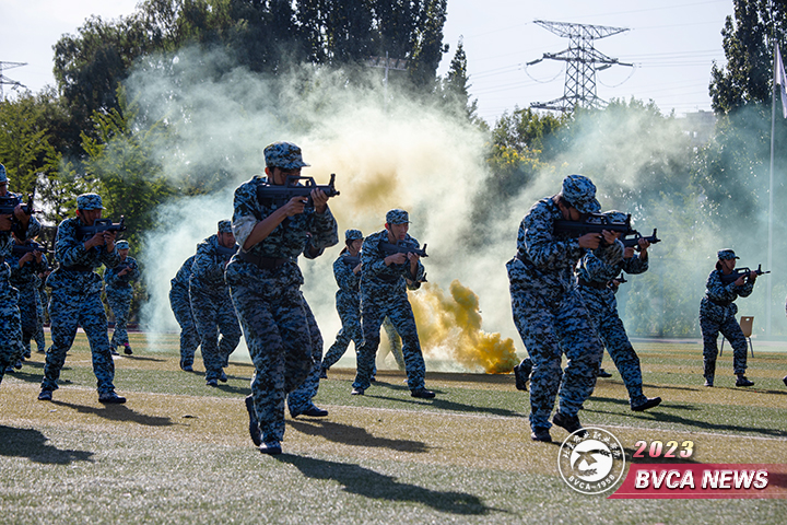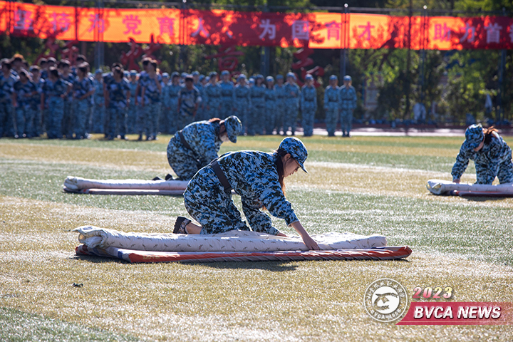 分列式结束后进行了精彩的军训成果汇报表演:内务展示、匍匐拳、手语操、战术、三声三相,新意十足,高潮迭起。