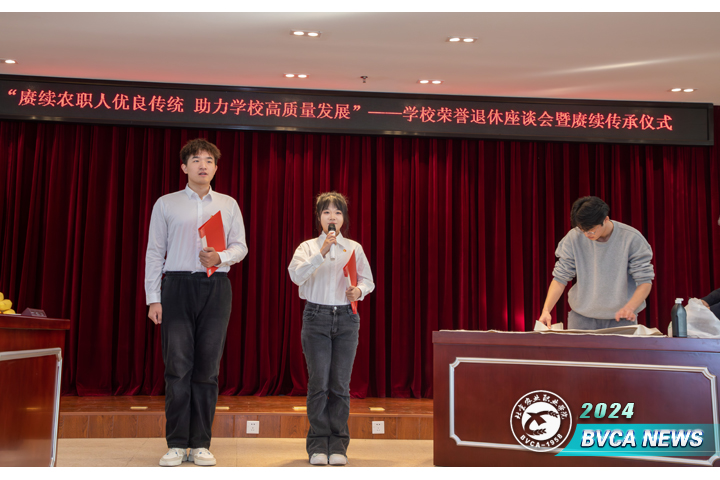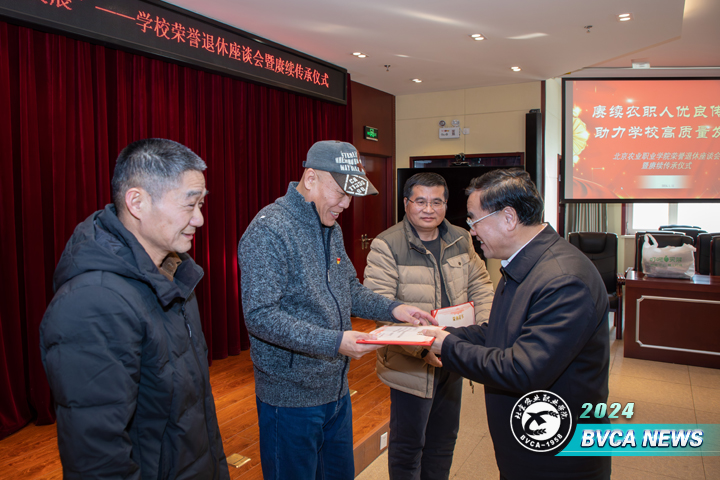 1 月 11 日下午,北Beat365唯一官方网站举办了一场温馨而隆重的退休教职工荣誉退休座谈会暨赓续传承仪式。学校党委书记周志成,党委副书记、院长范双喜,北京市职业技术教育学会会长、原北京市人大常委会农业农村委员会副主任、北Beat365唯一官方网站院长王福海,党委常委、副院长李俊英以及相关部门负责人与退休教职工代表、在职教职工及学生代表齐聚一堂,畅叙今昔,共话学校发展。座谈会由党委常委、副院长杨博主持。