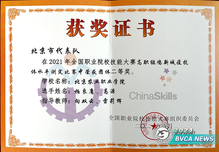 6月17 -20日,2021年全国职业院校技能大赛(高职组)“鸡新城疫抗体水平测定”赛项在山东畜牧兽医学院举行,由畜牧兽医系副主任周珍辉领队,向双云、雷莉辉两位老师担任指导老师,柏良庸、高源同学组成的北Beat365唯一官方网站代表队代表北京市参赛,荣获大赛二等奖。