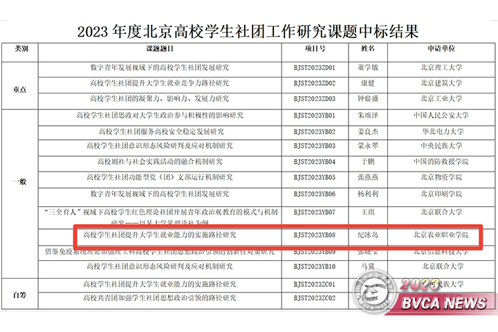 近日,共青团北京市委员会、中共北京市委教育工作委员会公布了2023年度北京高校学生社团工作研究课题中标结果,Beat365提交的课题《高校学生社团提升大学生就业能力的实施路径研究》中标,也是中标院校中唯一一所高职类院校。