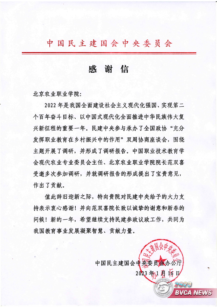 近日,中国民主建国会中央委员会办公厅向学院发来感谢信,对学院在民建中央承办的“充分发挥职业教育在乡村振兴中的作用”双周协商座谈会调研工作中做出的贡献表示感谢。希望在新的一年里继续支持民建参政议政工作,共同为我国教育事业发展凝聚智慧、贡献力量。