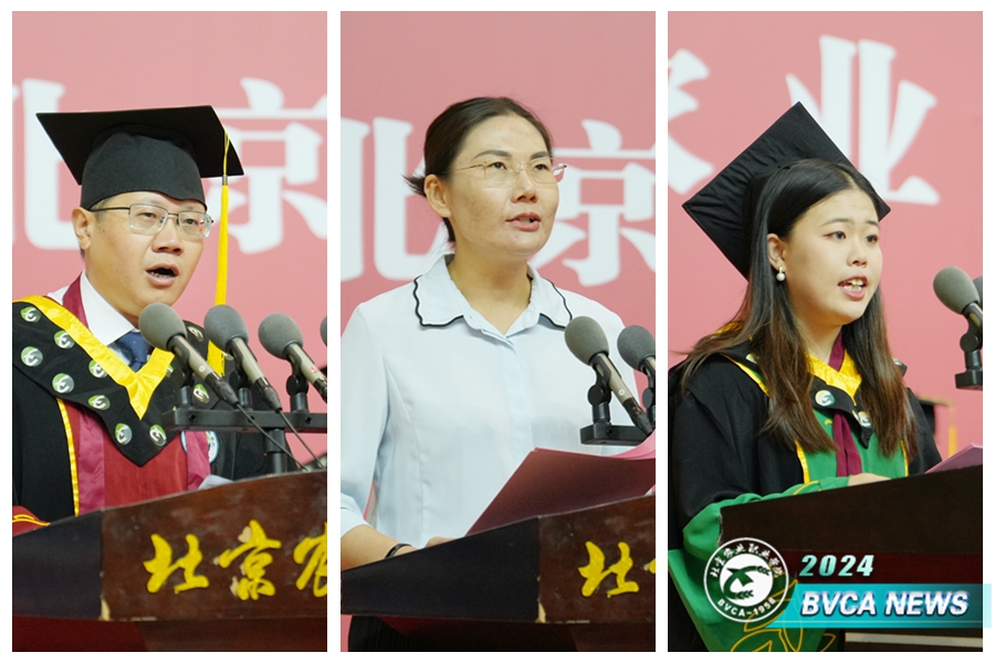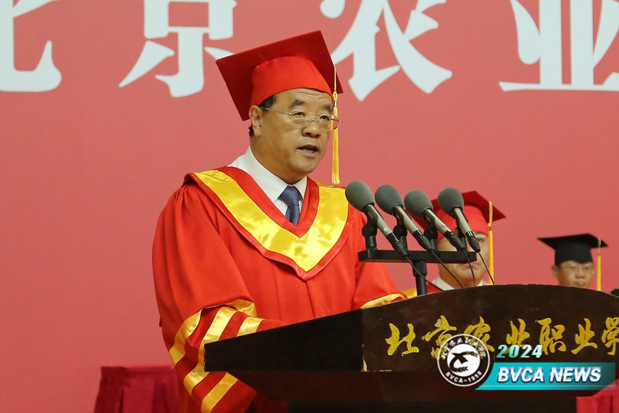 范双喜以“星辰大海,向远笃行,让青春在奋进中熠熠生辉”为题向毕业生致辞。他介绍了三年来学校紧跟国家职教改革发展步伐,抢抓新机遇、迎接新挑战蓬勃发展取得的丰硕成果,深情回顾了同学们三年来在学校拔节生长、璀璨绽放的美好时光。他带领同学们深刻思考“青春为谁闪耀”“青春在哪闪耀”“青春如何闪耀”这三个成长过程中必须面对的重要课题,为同学们离校前讲授了最后一堂“思政课”。他指出,青春必当为祖国闪耀,希望大家心怀“国之大者”,将“国家需要就是我们的选择,到国家最需要的地方建功立业”的铮铮誓言化作青年学子爱国报国的生动实践;青春应当在乡村振兴中闪耀,希望大家践行“务农、兴农、强农”责任担当,立志为推进农业农村现代化、全面乡村振兴、建设农业强国作出积极贡献;青春必须在拼搏奋斗中闪耀,希望大家传承学校光荣传统,扎根京郊大地,服务首善之区建设,在以中国式现代化推进中华民族伟大复兴的新征程中续写新篇章!