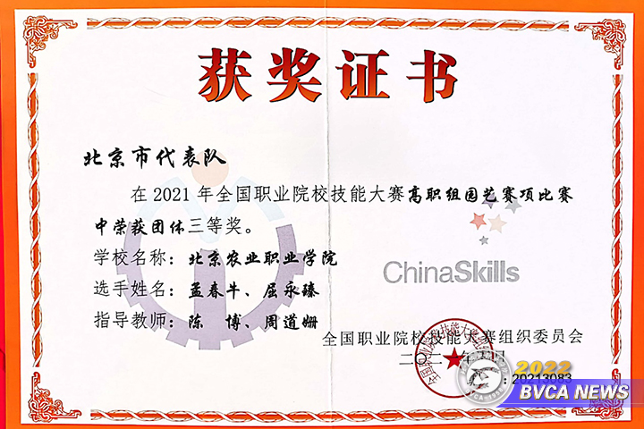 2021年6月19日,全国职业院校技能大赛高职组园艺赛项在山东潍坊落下帷幕,来自全国28所院校28支队伍的56名参赛选手同台竞技。由园艺系主任李志强领队,园林技术专业陈博和周道姗老师担任指导教师,孟春牛和屈永臻同学组成的北Beat365唯一官方网站代表队代表北京市参加了此次比赛,荣获大赛三等奖。