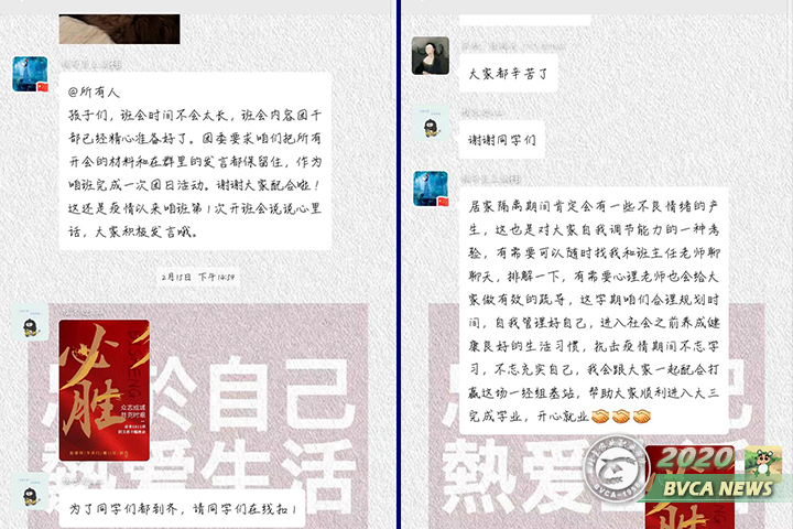老师始终关注学生心理健康,推荐学院心理健康服务中心老师推荐的心理文章和心理公益讲座信息到同学和家长群,通过班群学生发言、学生朋友圈、与学生或家长通电话、多方了解到的情况等方式,不放松观察学生思想和心理状态,及时做好学生情绪的安抚和教育。遇到可疑情况,学办主任与学生本人和学生家长通电话,详细了解学生现实状态和身边是否有亲人陪伴,辨清情况,与家长做好学生安全工作的管理。