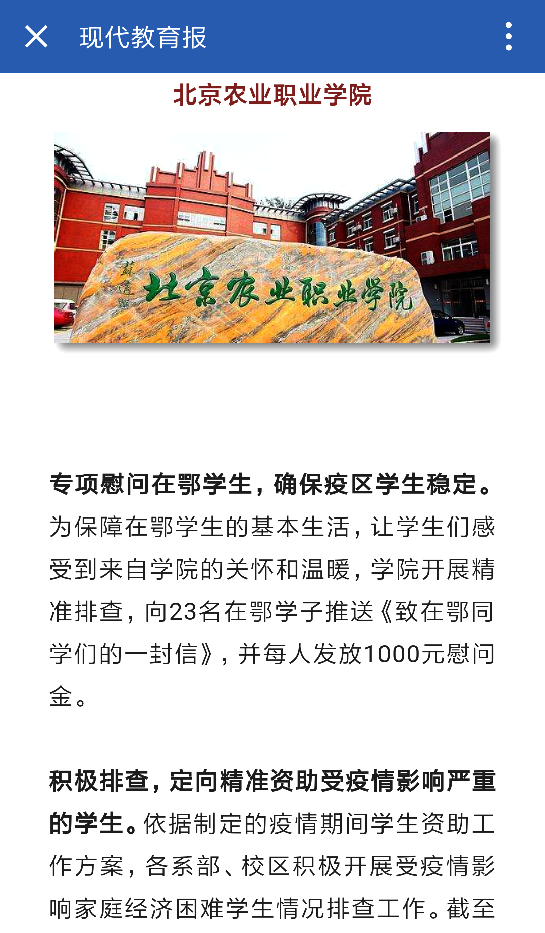 3月23日《现代教育报》:上网流量补贴、云勤工助学……北京精准资助,解决学生 “疫”路之困