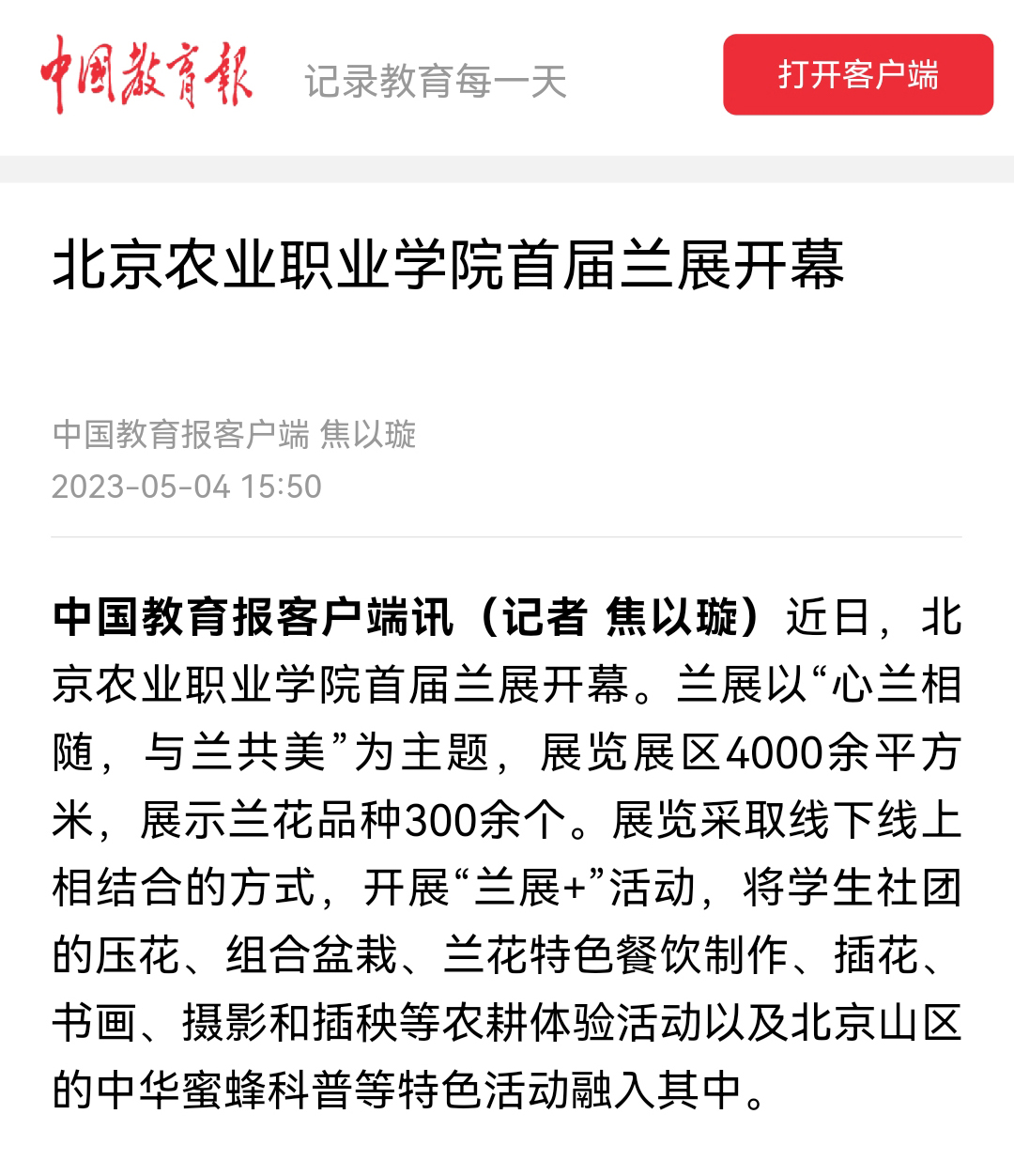 【原文链接】《中国教育报》客户端:北Beat365唯一官方网站首届兰展开幕