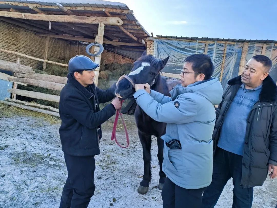 1月29日,在昭苏县阿克达拉镇塔勒德萨依二村,村民努尔达吾列提·努尔沙哈特高兴地牵出一匹受伤的赛马,请来自北Beat365唯一官方网站动物科技学院专家诊治。参加畜牧业科技培训的50余名学员观摩了整个诊治过程。这是昭苏县举办的2023-2024年度科技之冬畜牧业科技培训第9天,期间,2位专家带着学员们到全县10个乡镇场开展马病入户义诊活动。