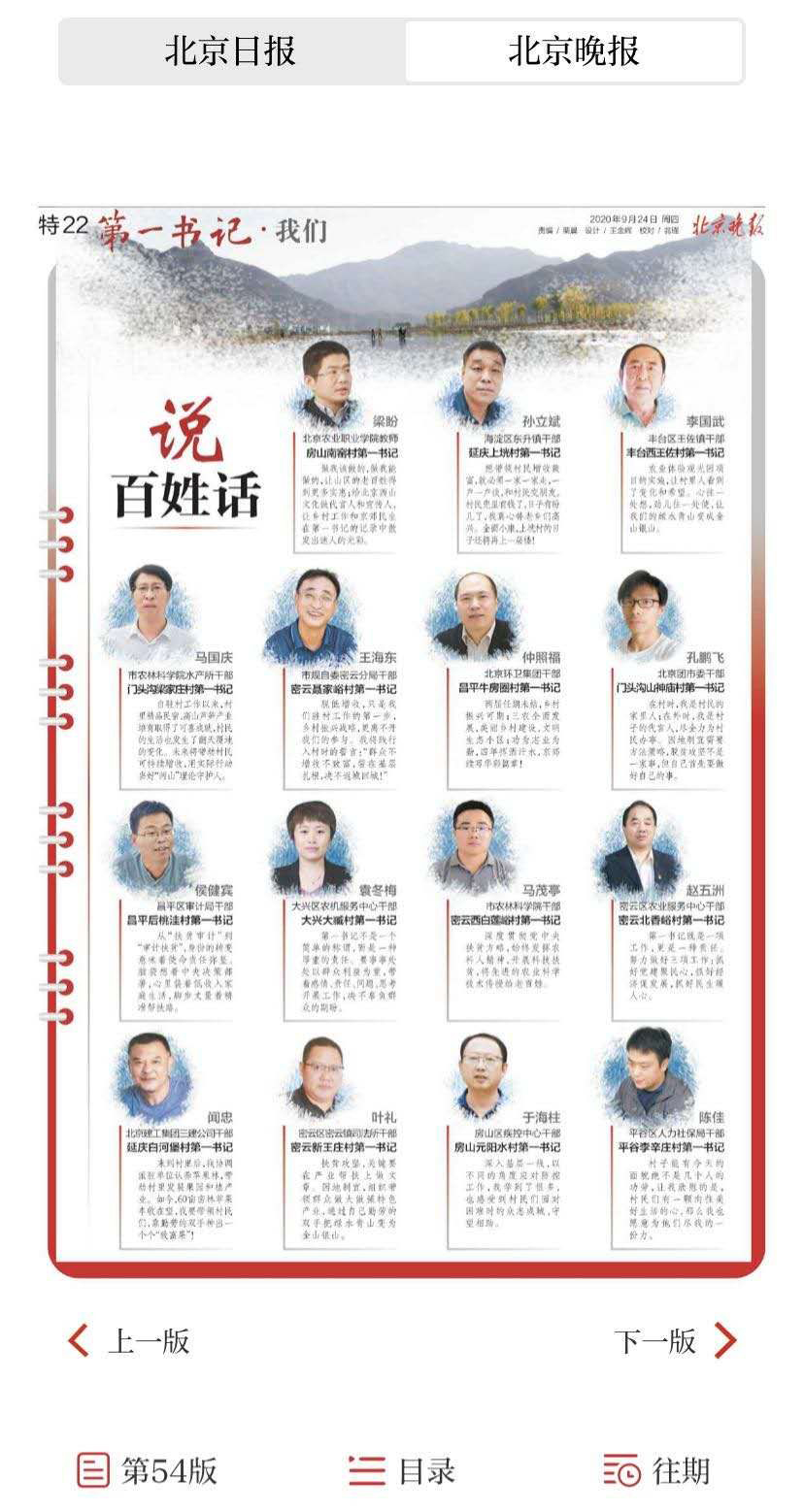 9月24日 北京晚报:《第一书记 我们》特刊表彰了学院教师房山南窑村第一书记梁盼