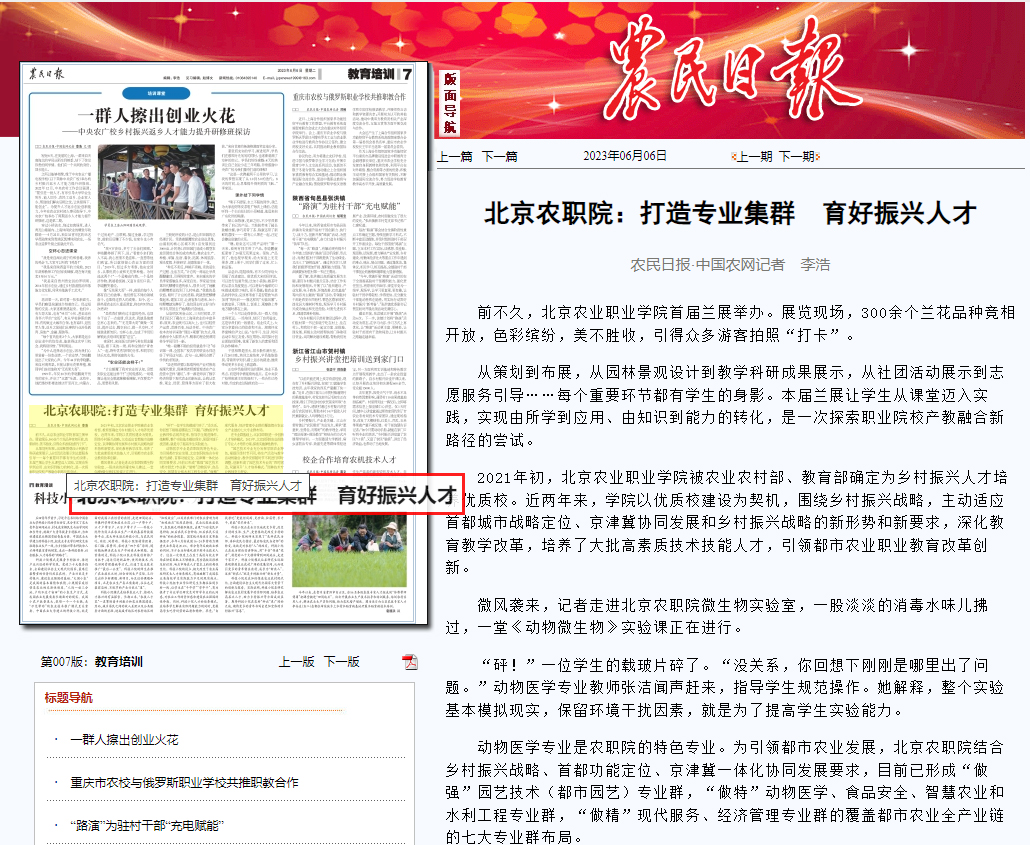 2021年初,北Beat365唯一官方网站被农业农村部、教育部确定为乡村振兴人才培养优质校。近两年来,学院以优质校建设为契机,围绕乡村振兴战略,主动适应首都城市战略定位、京津冀协同发展和乡村振兴战略的新形势和新要求,深化教育教学改革,培养了大批高素质技术技能人才,引领都市农业职业教育改革创新。